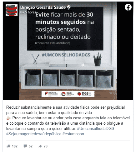 Numa altura em que ainda se mantém o dever de ficarmos em casa de modo a evitar e combater a propagação no novo coronavírus, a Direção-Geral da Saúde (DGS) recorreu ao Facebook para deixar um conselho: "Evite ficar mais de 30 minutos seguidos na posição sentado, reclinado ou deitado (enquanto está acordado)".