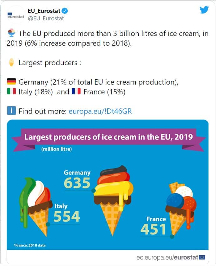 Porém, há outros dois países que também se destacam. Itália produziu 554 milhões de litros, o que significa 18% da produção total, e, ainda, França que é responsável por 15% da produção total com 451 milhões de litros produzidos da sobremesa típica do verão.