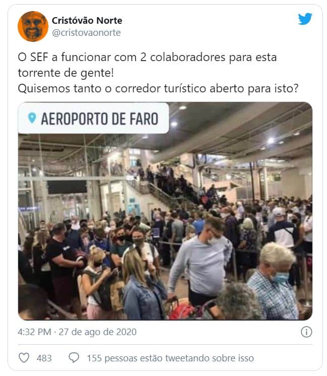 Foi divulgada nas redes sociais, na quarta-feira, uma fotografia que mostra o congestionamento nas chegadas do aeroporto de Faro. Ao Jornal de Notícias, fonte do Serviço de Estrangeiros e Fronteiras confirmou a veracidade da imagem, explicando que "se tratou de uma situação pontual e circunscrita, registada em apenas uma hora, no dia 26 de agosto". Segundo o SEF, durante esse tempo aterraram oito voos no aeroporto, o que correspondeu a mais de 800 passageiros controlados.https://24.sapo.pt/assets/static/twitter_embed.html?url=https://twitter.com/cristovaonorte/status/1299006794493198337