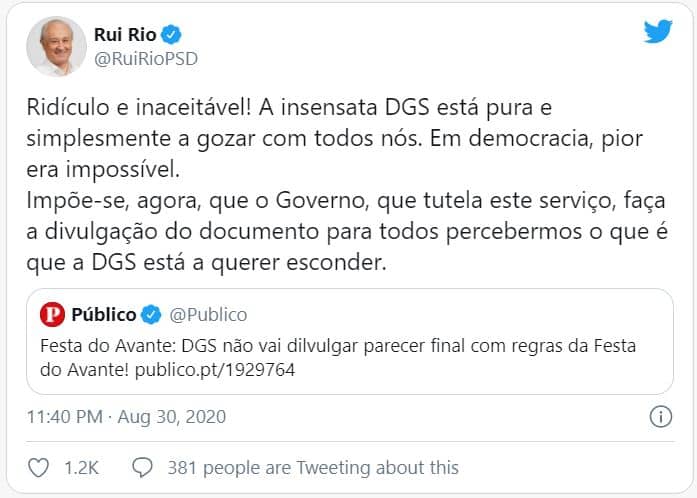 Rui Rio juntou-se a Marcelo Rebelo de Sousa no protesto contra o secretismo das medidas. "Ridículo e inaceitável. A insensata DGS está pura e simplesmente a gozar com todos nós. Em democracia, pior era impossível. Impõe-se agora que o Governo, que tutela este serviço, faça a divulgação do documento para todos percebermos o que é que a DGS está a querer esconder", escreveu no Twitter.